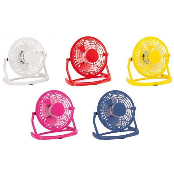Bold mini desk fan with USB connection in fun colours, Compact design. Generous central area for printing or resin doming. Presented in an attractive design box. Colours: Blue, Fuchsia, Red, White, Yellow. Dimensions: 14.9 x 14 x 9.5 cm.
