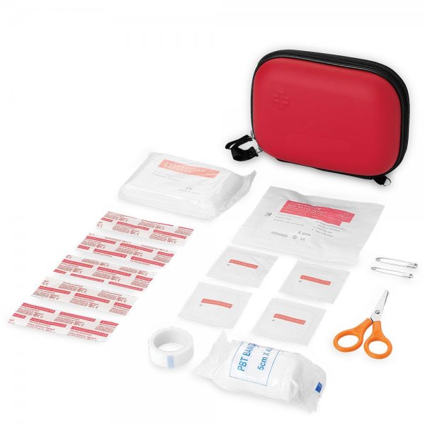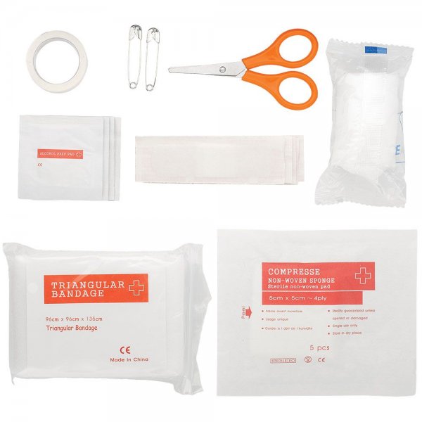 Features: EVA pouch including 4 alcohol pads, 1 non woven sponge, 5 adhesive plasters, 1 paper tape, 1 bandage, scissors, 2 pins and 1 triangle bandage