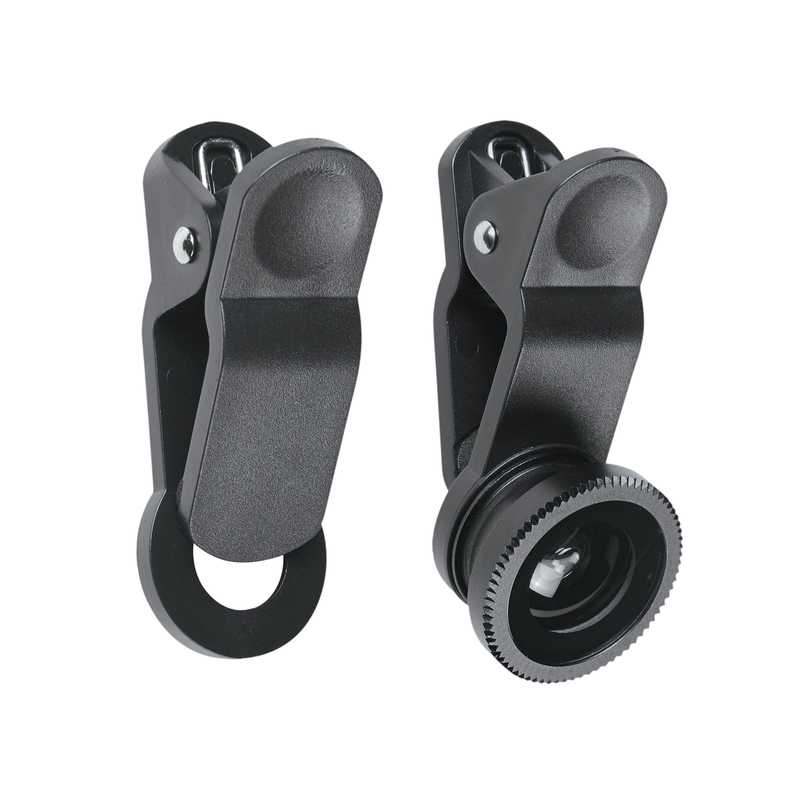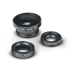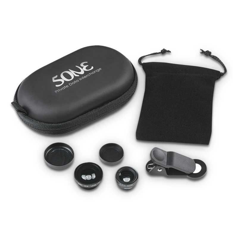 Fisheye lens set with two 180 degree lenses with both .5 and .67 magnification and one macro lens. Also includes the phone clip and a drawstring velvet pouch. The complete set is presented in an EVA carry case and branding is on the case. A production lead time of 10 - 15 working days applies to this product.