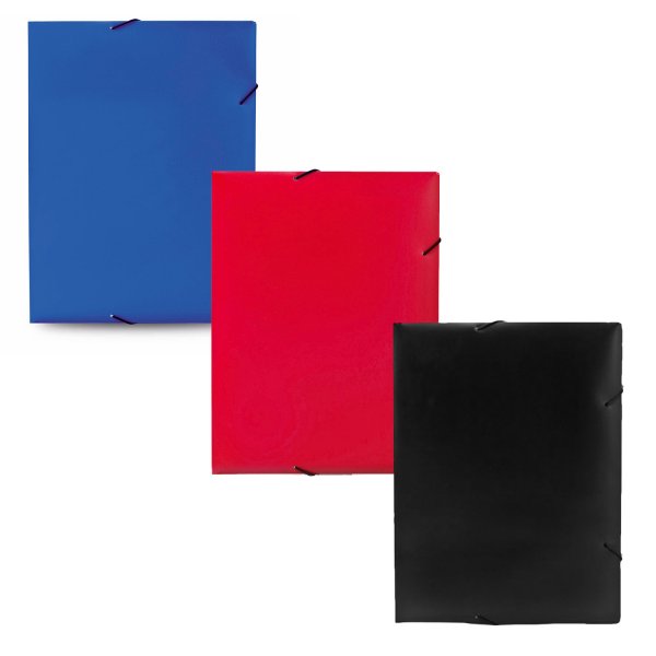 High capacity folder with elastic band closure, in varied colours, with translucent finish and tripe folding system. Colours: Black, Blue, Red. Dimensions: 23.8 x 31.5 x 1.7 cm.