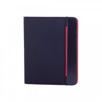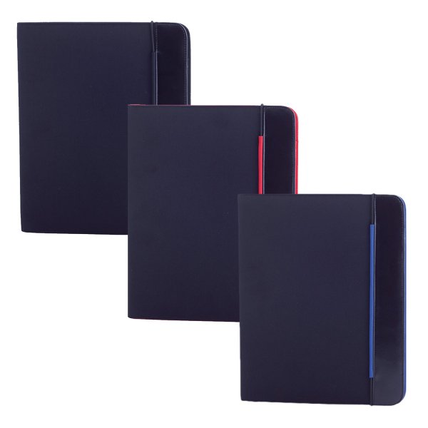 Bicolored design folder in bright tones, in soft microfibre with elastic band closure. Matching color inside with notepad of 20 blank sheets, flap pocket, card holders and pen holder. Colours: Black, Black/Blue, Black/Red. Dimensions: 25.3 x 31.5 x 1.3 cm.