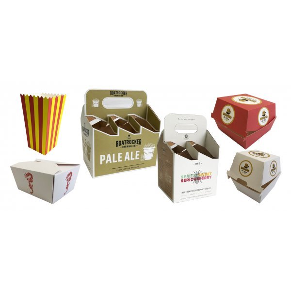 Food and Beverage Packaging are all produced using food grade boards, inks and finishes. Die cut, standard stock printed food packaging: