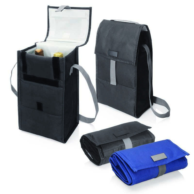 Item Features: Place in the freezer overnight - frozen gel panels will help keep food cool for hours|Ideal for 2 wine bottles|Foldable convenience|Shoulder carry strap when in use|Carry handle in folded mode|Pocket in lid for corkscrew|Removable divider converts cooler to large single volume lunch bag|Sold with your choice of black or silver badge, either of which will laser engrave white or can be printed