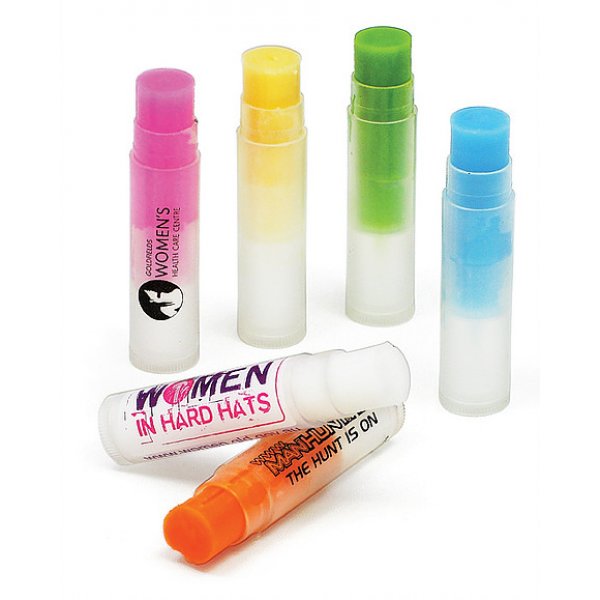 Slimline Lip Balm: strawberry (pink), vanilla (white), berry (purple), lemon (yellow), orange (orange), apple (green), mint (blue), chocolate (brown). Custom lip balm flavour/colour options available for additional charge. Minimum quantity 150 pcs.