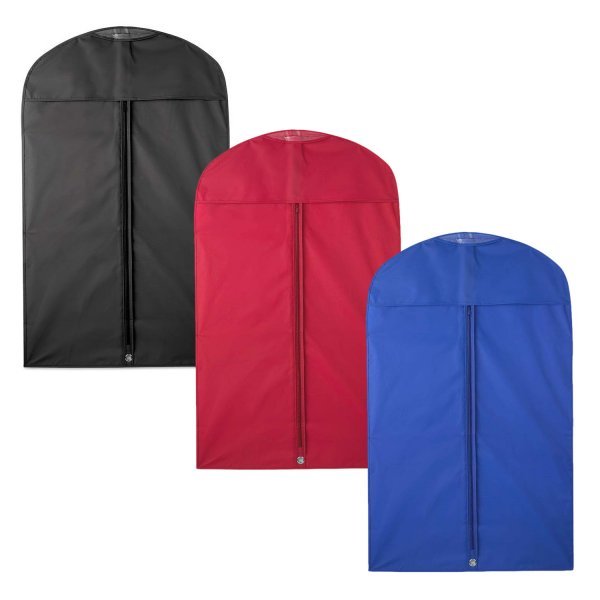 Suit holder in soft PEVA material in varied colours. With matching color zipper closure and reinforced metal ring for hanger. Colours: Black, Blue, Red. Dimensions: 60 x 100 cm