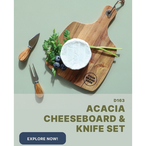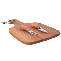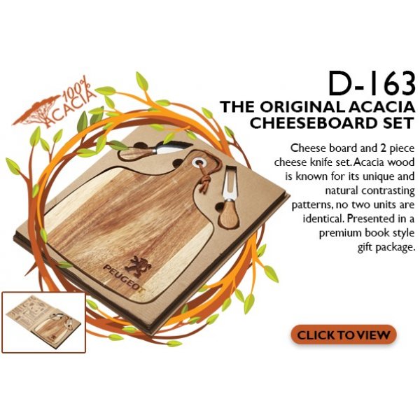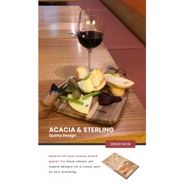 Cheese board and 2 piece cheese knife set. Acacia wood is known for its unique and natural contrasting patterns, no two units are identical. Presented in a premium book style gift package. Colours: Natural. Dimension: 335mm H x 255mm W.