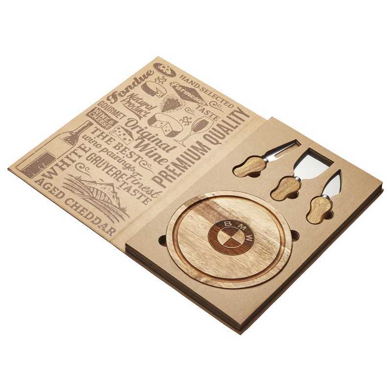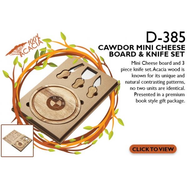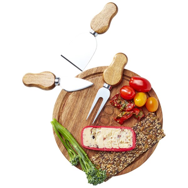 Mini Cheese board and 3 piece knife set. Acacia wood is known for its unique and natural contrasting patterns, no two units are identical. Presented in a premium book style gift package. Colours: Natural. Dimension: Board: 190mm Diameter.
