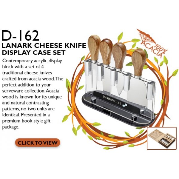 Contemporary acrylic display block with a set of 4 traditional cheese knives crafted from acacia wood. The perfect addition to your serveware collection. Acacia wood is known for its unique and natural contrasting patterns, no two units are identical. Presented in a premium book style gift package. Colours: Acacia. Dimension: Acrylic Stand: 95mm H x 175mm W.