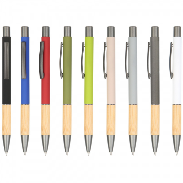 Click action aluminum pen, Rubberized coloured barrel, Bamboo grip, Gunmetal sprayed clip, tip and trims. 1.0mm Black ink slim refill, German Dokumental Black Ink, T.C. Nib. Colours: Black, Beige, Dark Blue, Dark Green, Dark Grey, Light Green, Light Grey, Natural, Red. Dimensions: