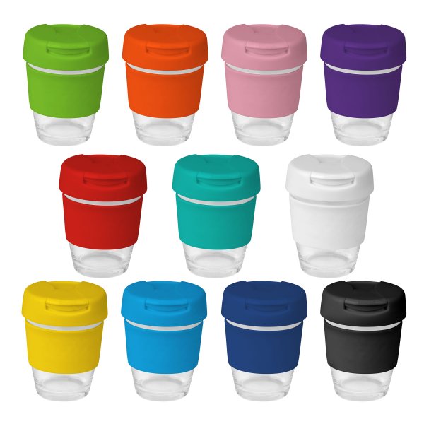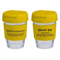 This glass reusable cup is made from high-quality non-porous glass. A very sturdy and stylish solution to enjoying your everyday cuppa. Available in 8oz/235ml with various coloured bands and lids. Mix and Match welcome. Packed in a brown box with window. Customise your Karma Kups with brilliantly colored lids and bands, then add your logo for the finishing touch. Karma Kups are the hot new way to enjoy drink on the go! Do not microwave or use in microwave oven; top rack dishwasher safe, but hand wash recommended so the print last. Size: 86mm dia x 110mm. Band Size: 80mm dia x 46mm. Individual Box 12cm Height, 8.2cm Width, 8.2cm Deep.