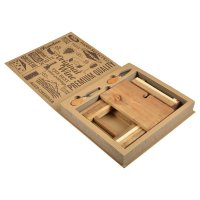 Take your cheese board out to the park with this perfect outdoor set. A foldable board that quickly becomes a cheese and wine table set for 2! Built for the outdoors and great at the beach or a local park. Each board folds down with an easy carry handle and hidden magnets to help store your knives away when not in use. Acacia wood is known for its unique and natural contrasting patterns, no two units are identical. Presented in a premium book style gift package with instruction sheet. Colour: Natural.