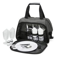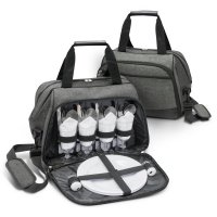 Classically designed four person picnic bag which is manufactured from poly-canvas that has an on-trend, heather style fabric finish. It has a large zippered cooler compartment which is lined with thick PE foam insulation encased in a water-resistant PEVA inner liner. The side compartment has a zip around closure that allows it to open out to 90 degrees revealing plates, cutlery, napkins and glasses for four people as well as salt and pepper shakers. Other features include an external zippered pocket, carry handles with a PU/Velcro wrap and a removable shoulder strap which is adjustable and has a comfortable shoulder pad. Colours: Grey.