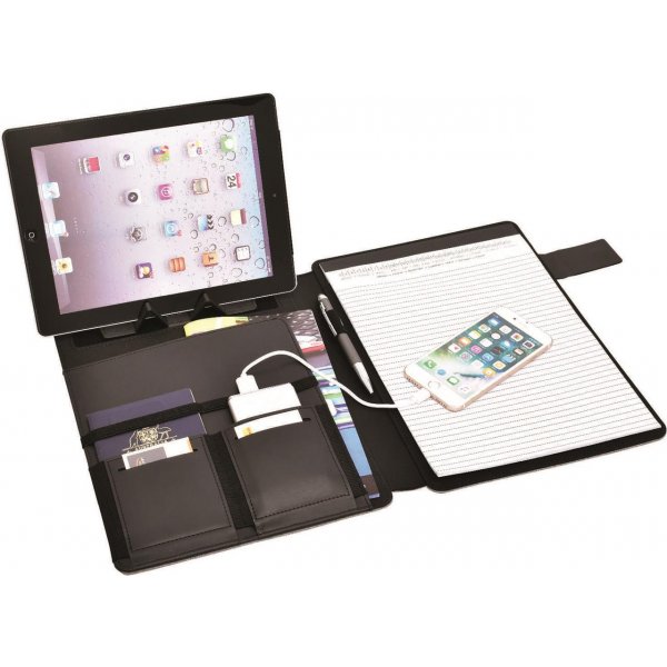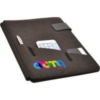 Hands-free A4 Portfolio, as the name suggests is designed to keep your hands free while safely securing in place your most valued accessories. This portfolio has pockets on the inside and outside designed to hold your mobile phone, pens, business and credit cards, phone charger, IT accessories and even includes an ingenious flat folding mobile phone/tablet stand. Made from the latest fabric inspired materials, this portfolio features a leather-look magnetic closure and is supplied with a ruled notepad. Accessories not included. Colours: Black, Grey. Dimensions: 31cm x 23.5cm wide (closed).