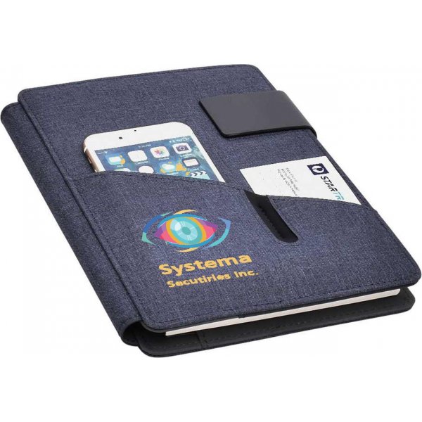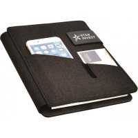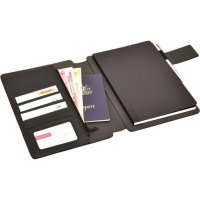 Hands-free A5 Portfolio, as the name suggests is designed to keep your hands free while safely securing in place your most valued accessories. This portfolio has pockets on the inside and outside designed to hold your mobile phone, pens, business and credit cards, passport, cash and IT accessories. Made from the latest fabric inspired materials, this portfolio features a leather-look magnetic closure and is supplied with a ruled, side folding notepad. Accessories not included. Colours: Black, Grey, Navy. Dimensions: 22.5cm x 17cm wide (closed).