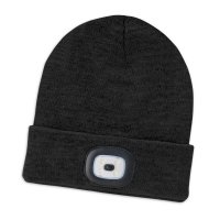 Radical knitted acrylic beanie with twin layer construction for extra warmth, a roll up cuff and a unique built-in head lamp. The lamp has three light settings and uses futuristic COB (Chip-on-Board) technology which increases both the light intensity and the battery life. The headlamp is easily recharged via USB port or mains adaptor. It is supplied with an instruction leaflet. 0.5W charging power. Colours: Black, Navy. Sizes: one size fits most adults.