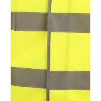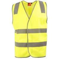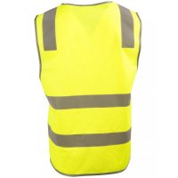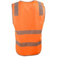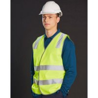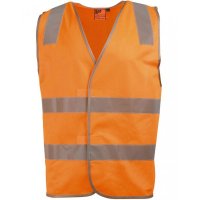 Velcro closure on front. Grey banding all around to protect fraying of fabric. Hoop pattern with generic reflective tapes for night safety. Conforms to AS/NZS 4602.1:2011 Class D/N. Day and night safety wear. Colours: Fluro Orange, Fluro Yellow. Sizes: 8/10, 12/14, 16/18, 20/22, 24/26, 28/30.
