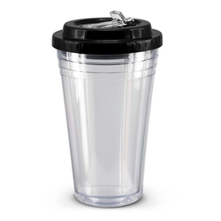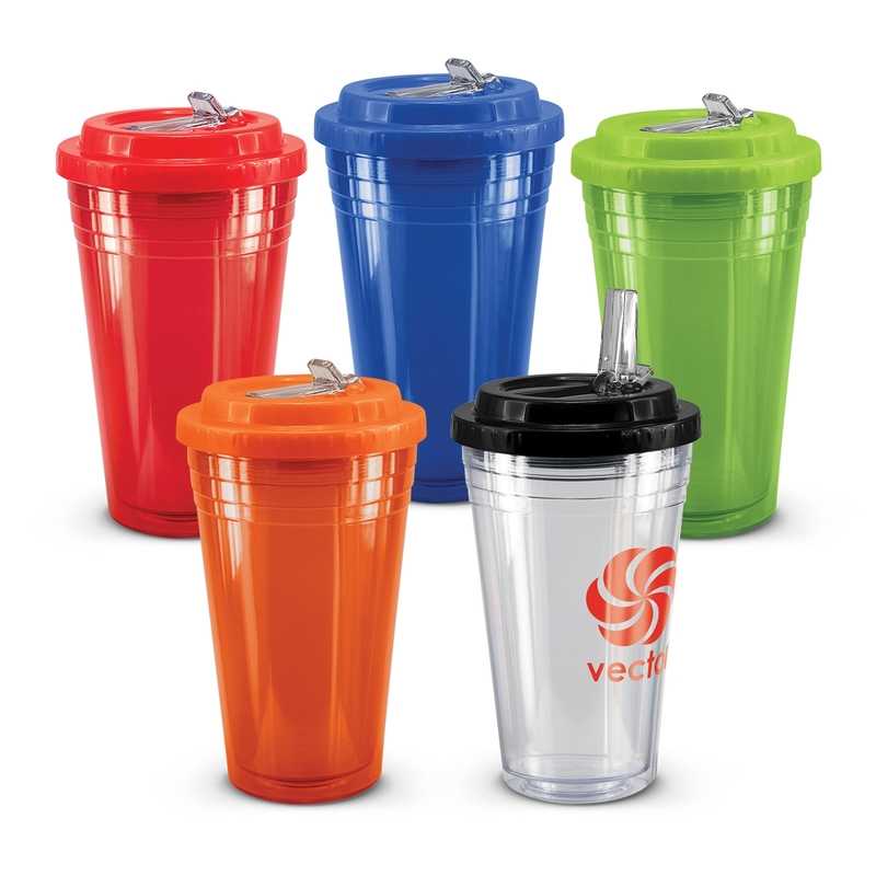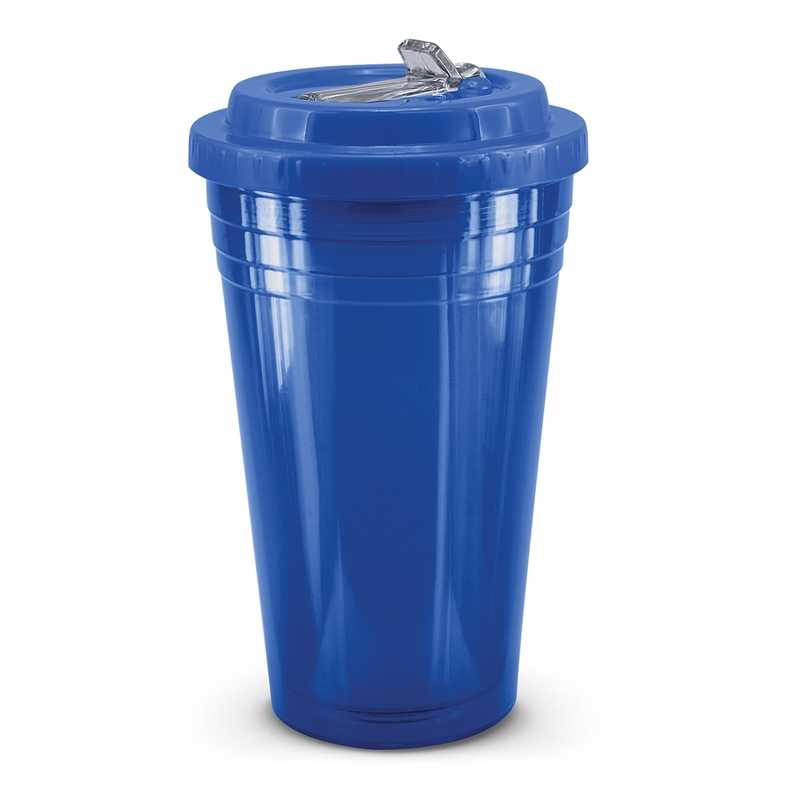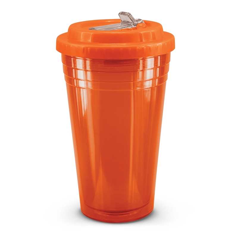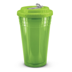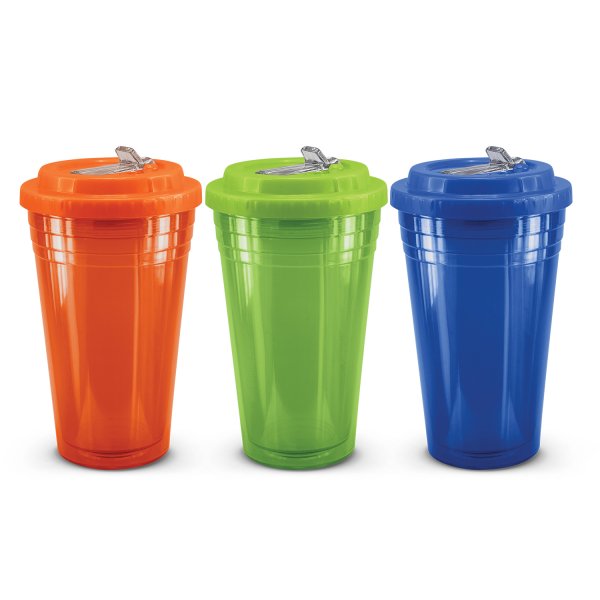 Unique 470ml BPA-free double wall tumbler which will keep drinks cool for longer. It is manufactured from translucent AS material. It has a secure screw on lid with a leakproof flip valve and a drinking straw. This product is not dishwasher safe and handwashing is recommended. Colours: Orange, Bright Green, Blue. Dimensions: Dia 102mm x H 178mm.