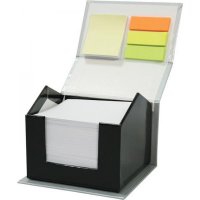 Unique House Style Memo Pad and Sticky Note set with loose leaf pages, 3 different colour sticky flags, and 1 sticky note pad. Colours: Black/White. Dimensions: 90 x 75 x 95mm.