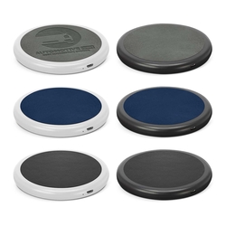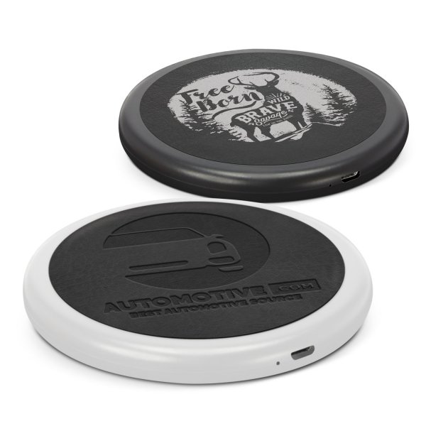 Round 5W phone charger that will charge devices that are enabled for wireless charging and will work with most modern phones. Simply plug it into any USB port or a mains adapter and place a compatible device on it for convenient wireless charging. Imperium has a smart leather-look surface which can be debossed or printed. It is presented in a black box with an 80cm Micro-B USB cable and an instruction leaflet. Please note that some phone cases may affect the wireless charging connection. Colours: White/Black, Black/Black. Dimensions: dia 85mm x 5mm.