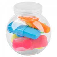 Impress your customers with a set of 5 colour (pink, orange, yellow, green and blue) mini highlighters in a clear plastic jar, sealed with a screwed on foggy plastic lid. Mini highlighter cap has a small clip. Printed with your brand logo, this jar highlighters will look attractive. Colours: Blue, Green, Orange, Pink, Yellow. Dimensions: Jar: 70mmW x 75mmH x 57mmD; Highlighter: 22mmW x 57mmH x 17mmD.