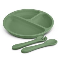Ergonomic kids' plate and cutlery set made from durable, BPA-free and food-safe silicone. The 19.5cm plate has dividers to keep foods separate, and the matching silicone cutlery is soft on little gums. This product has a lead time of 25 working days by air freight, and larger orders can be sea freighted on request to reduce the freight cost. Colours: Ecru, Yellow, Peach, Sage, Pale Blue. Dimensions: Plate: Dia 195mm x H 30mm. Cutlery: L 135mm x W 35mm x 10mm.