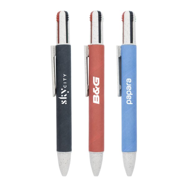This 4 in 1 pen, crafted from paper and wheat straw, is an eco friendly choice for everyday use. Featuring green, red, blue, and black ink in a pen. It offers versatility in one convenient writing instrument. Colours: Black, Light Blue, Red. Dimensions: 14mm D x 142mm H.