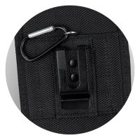 Rugged phone pouch that will fit most modern phones up to 6.8". Made from tough and durable 800D oxford polyester, this phone pouch can be attached to a belt or a bag using the belt clip or carabiner. It also features a handy elastic pen loop and a leather-look PU patch for prominent branding. Colours: Black. Dimensions: H 183mm x W 98mm x 37mm.