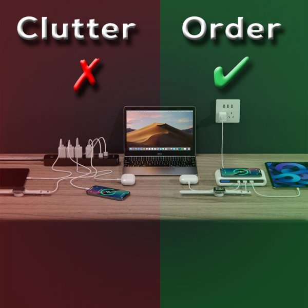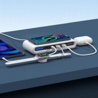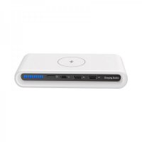 Bid farewell to the chaos of messy cables with the Korda multifunctional charging station. Delivering 15 Watts of wireless power to your Qi-compatible devices, the side indicator lets you quickly find your phone in the dark and adjust the ambient light at the bottom by pressing the on/off button. The sleek-looking Korda has three additional USB fast charging ports, allowing simultaneous charging of multiple devices. Equipped with Foreign Object Detection, the charger protects against over-current, over-voltage, and short-circuit, ensuring this multi-port charging dock is safe and worry-free. Please Note: Your phone must support fast charging, and for optimal performance, you use a Quick Charge 3.0 wall adaptor (not included). Includes Type-C charge cable and user manual. Colours: White. Dimensions: 175 x 83 x 32 mm.