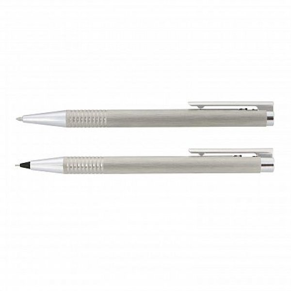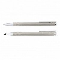Superb pen and pencil set featuring a brushed stainless steel retractable ball pen delightfully partnered with a matching mechanical pencil. Both have a finely tuned, spring loaded metal clip and matching shiny chrome accents. The ball pen has a black LAMY M16 refill with 8000 metres of writing ink and a tungsten carbide ball for improved writing quality. The pencil has a 0.5mm LAMY M41 HB lead refill and both barrels laser engrave to a natural etch. LOGO is 100% made in Germany with the LAMY brand tastefully inscribed on the upper barrel and the set is beautifully presented in a LAMY gift box.