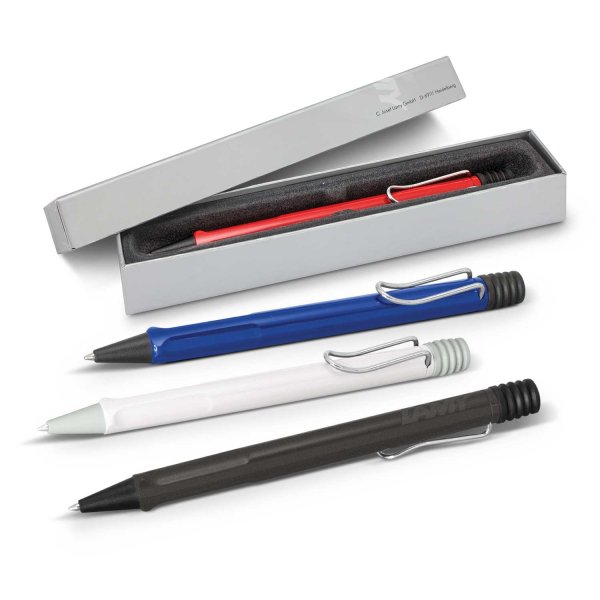 Classic ball pen which is manufactured from highly polished ABS plastic with a design inspired metal spring loaded clip and a soft rubber push button. It has a black LAMY M16 refill with 8000 metres of writing ink and a tungsten carbide ball for improved writing quality. SAFARI is 100% made in Germany with the LAMY brand tastefully moulded in the upper barrel and it is beautifully presented in a LAMY gift box.