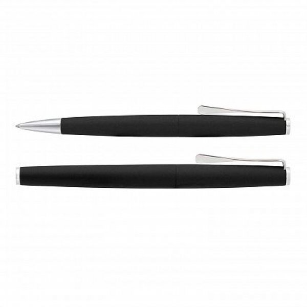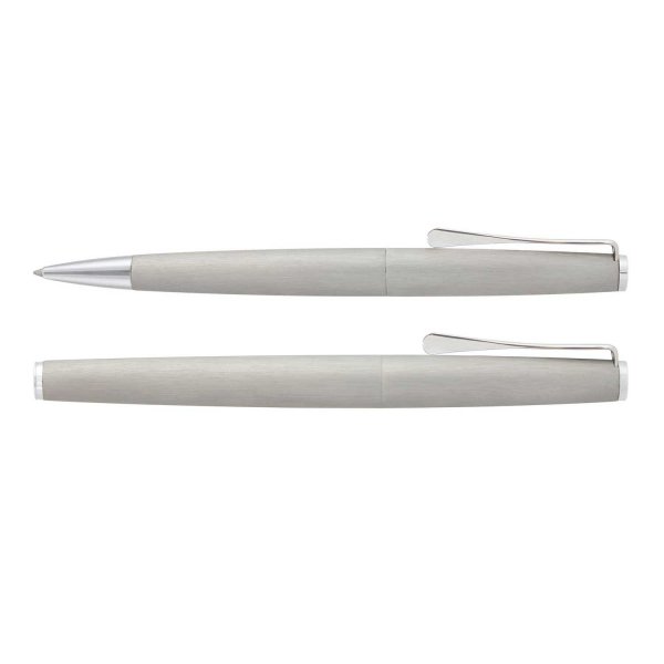A pen set of rare quality which bears all the hallmarks of the finest LAMY design and quality. It features a twist action ball pen and a rolling ball pen with the choice of brushed stainless steel or heavy brass with matt finishes. These stunning pens feature a unique propeller inspired clip with matching shiny chrome accents. The ball pen has a black LAMY M16 refill with 8000 metres of writing ink and a tungsten carbide ball for improved writing quality. The rolling ball pen has a black LAMY M63M rolling ball refill with 750 metres of smooth writing ink. STUDIO is 100% made in Germany with the LAMY brand tastefully inscribed on the upper barrel of the ball pen and the cap of the rolling ball pen. Both pens are beautifully presented in a LAMY gift box. The stainless steel barrels laser engrave to a natural etch and the heavy brass barrel laser engraves to a mirror finish.