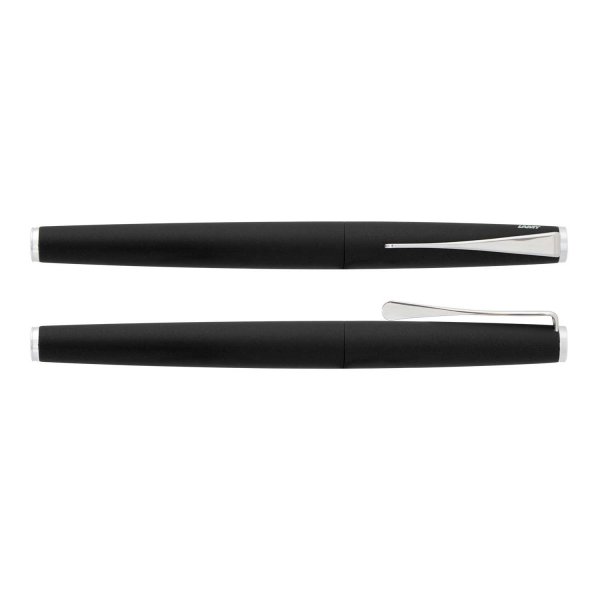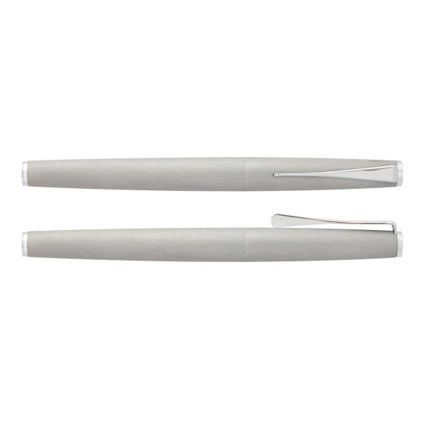 Elegant rolling ball pen which offers the choice of brushed stainless steel or heavy brass with matt finishes. This stunning pen features a unique propeller inspired clip with matching shiny chrome accents. It has a black LAMY M63M rolling ball refill with 750 metres of smooth writing ink. STUDIO is 100% made in Germany with the LAMY brand tastefully inscribed on the upper barrel and it is beautifully presented in a LAMY gift box. The stainless steel barrel laser engraves to a natural etch and the heavy brass barrel laser engraves to a mirror finish.