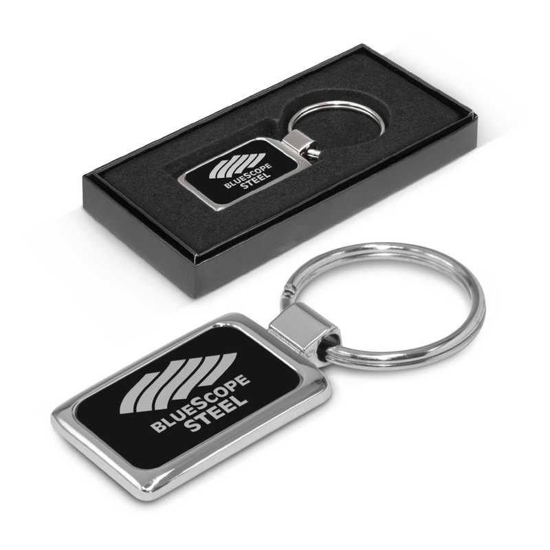 Metal key ring with an aluminium finish on one side which laser engraves to an oxidised white colour. The reverse side has a plated shiny chrome finish which engraves to a natural etch. It is nicely presented in a black gift box.