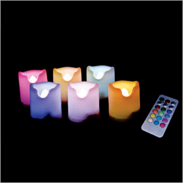 The set includes six plastic multi color LED votives and one remote. Use the remote control to turn on/off the candles, set timer and choose colors. Packed individually in cardboard box. Colours: White. Dimensions: diameter 35mm x 45mm