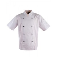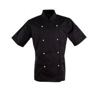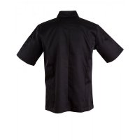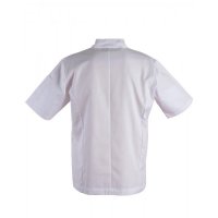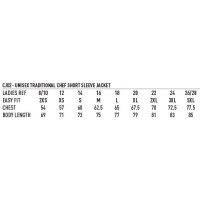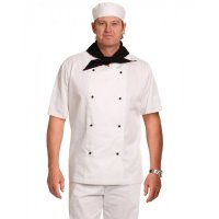 Mandarin collar. Double breasted with 8 interchangable buttons. Long sleeves with flap-over wrist band. Shorts sleeves. Colours: Black, White. Sizes: 8/10 12 14 16 18 20 22 24 26/28.