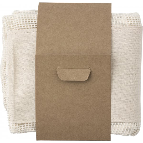 Cotton mesh reusable produce bags in a set of three, bundled by a kraft paper sleeve. The bags close with a drawstring and have a cotton panel in the front, suitable for personalisation. Colours: Khaki. Dimensions: 16.0 (L) x 15.0 (W) x 2.3 (H) cm.