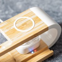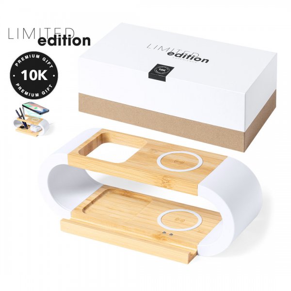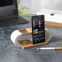 Charger Organiser Multi Function Limited Edition Line: mobile device/tablet holder, pens pencils/stationery organiser, 10W wireless chargers. A balance between technology, sustainability and functionality that offers an innovative and sophisticated design. Colours: Natural/White. Dimensions: 22.4 x 9.6 x 7.7 cm, 242 gram.