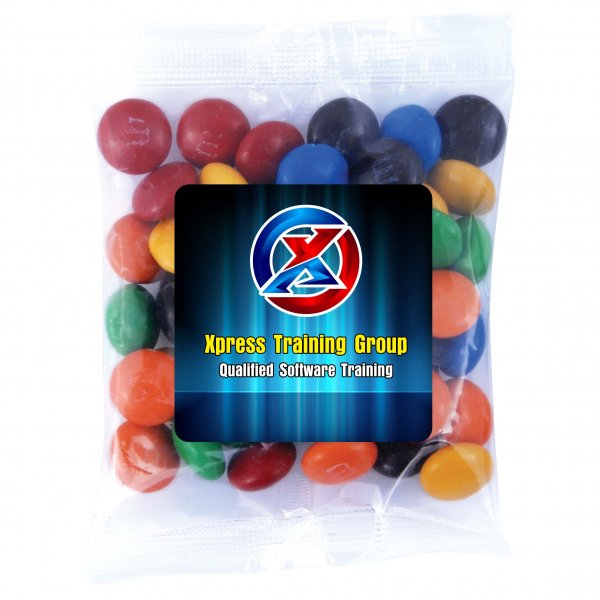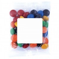 50 gram cello bag of assorted colour milk chocolate M&M's (Green, Red, Orange, Yellow, Brown and Blue). Allergen label pre-applied to back of cello bag. Proudly made and packaged in Australia. Colours: Clear. Dimensions: 80 x 110mm (LxH) (Approx).