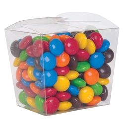 170 grams of assorted colour milk chocolate M&M's (Green, Red, Orange, Yellow, Brown and Blue) packed in clear Mini Noodle Box. Dimensions: Top: 74 x 64 x 50mm (LxHxD), Base Dimensions: 60 x 46mm (LxH).