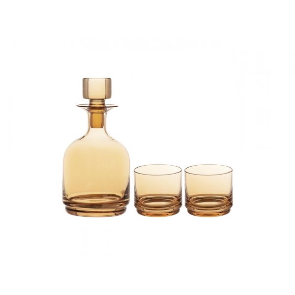 Add a splash of colour to your summer with this three-piece stacked decanter set from the Maxwell & Williams Glamour collection. Designed with whisky lovers in mind, it includes a decanter with a glass stopper and two round tumblers. With an elegant vibrant tone and striking stacked profile, this gorgeous set looks beautiful on display and will elevate any table setting. Handmade from quality glass, it’s a unique and beautiful gift idea. Set includes 1 x 450ml decanter, 2 x 350ml tumblers. Colours: Gold. Carton Dimensions: 42 (l) x 22 (w) x 24 (h) cm.
