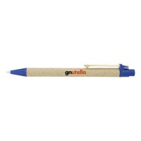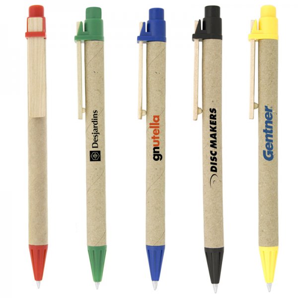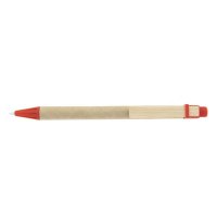 A click action ballpoint pen made of recycled paper and features a wooden clip. The barrel is made of environmentally friendly biodegradable paper. Colours: Black, Blue, Green, Orange, Red, Yellow. Dimensions: 136mm long.