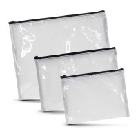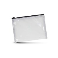 Small cosmetic bag which is manufactured from soft transparent plastic. It has a black zippered closure with black stitching and a polyester lining which can be branded in full colour on both sides at no extra cost. A production lead time of 15 working days applies to this product by air freight and larger orders can be sea freighted on request to reduce the freight cost. Colours: White. Dimensions: L 185mm x W 145mm.