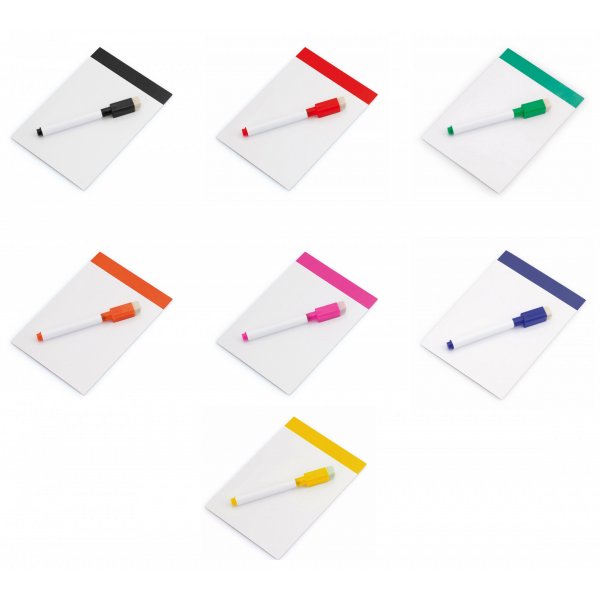 Magnetic board in a wide range of brightcolours Magnetic marker with eraser included. Colours: Black, Blue, Fuchsia, Green, Orange, Red, Yellow. Dimensions: 10.5 x 15 cm.