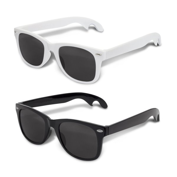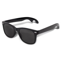 Fashion sunglasses with an impact-resistant polycarbonate frame and arms which are fitted with CE standard 100% UV 400 lenses that provide both UVA and UVB protection. Both arms feature a novel bottle opener and they can be supplied in an optional microfibre pouch, Stylo sunglass pouch or Montego sunglass case for an additional cost. Colours: White, Black with Black lenses. Dimensions: W 165mm x H 47mm x 22mm (closed).