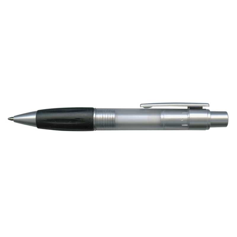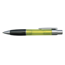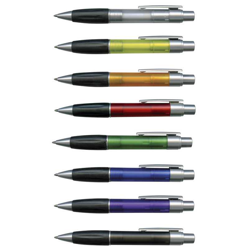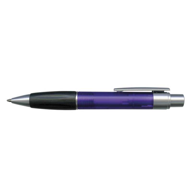 Retractable plastic ball pen with a soft rubber grip, a frosted translucent barrel and metallic silver trim. It has a blue TRENDS large volume refill with 1800 metres of German manufactured DOKUMENTAL ink and a tungsten carbide ball for improved writing quality. Black ink is available for an additional charge.