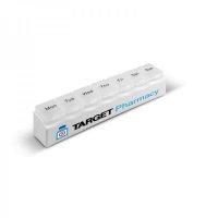Unique medication organiser which has seven individual pill boxes that are easily removed. Each box is clearly marked with the day of the week for easy medication management. Colours: White with Frosted Clear boxes. Dimensions: W 188mm x L 35mm x 38mm.