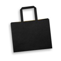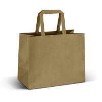 Medium-sized paper carry bag made from 180gsm FSC-certified materials with a reinforced base and square-folded 100gsm paper handles. This bag is landscape orientated with handles and gusset along the longer edges. Colours: Black, Natural, White. Dimensions: H 196mm x W 248mm x Gusset 120mm (excludes handle). Handle Length: 270mm.