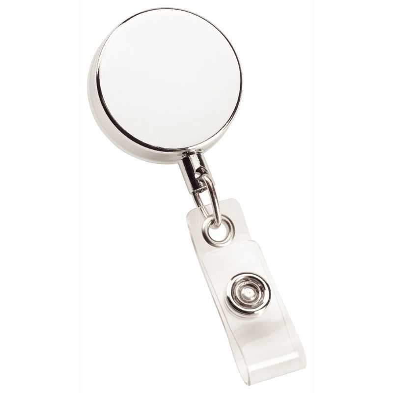Metal zip pull badge silver with metal clip and retractable cord.