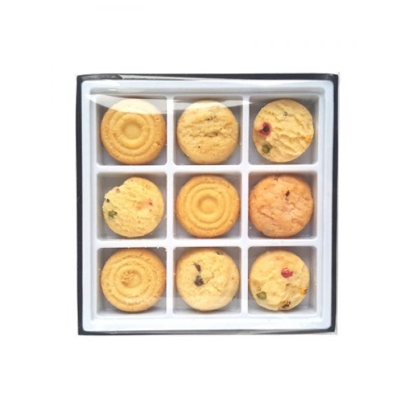 9 x Mini Assorted Cookies (Anzac, chocolate chip, M&M's, shortbread) beautifully packed in a clear gift box and branded with a custom printed sleeve. Box Colours: Black/Clear, White/Clear. Dimensions: 149 X 149 X 20, 81 grams.