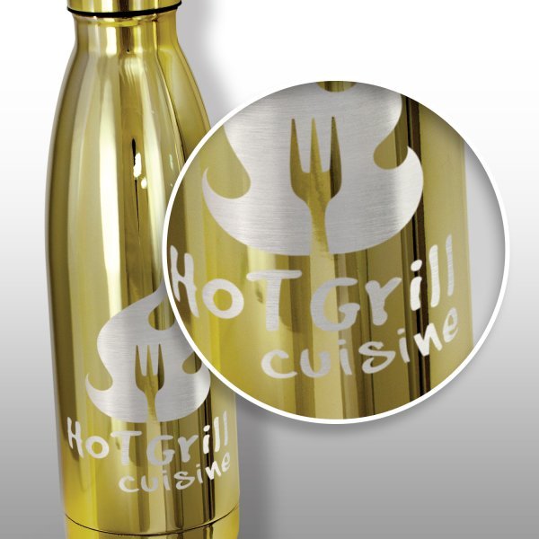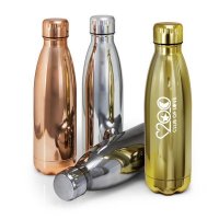 Trendy 500ml double wall, vacuum insulated stainless steel drink bottle with a timeless design. It is finished in a stunning shiny UV lacquer and has a matching screw on lid. Mirage will keep drinks cold for 24 hours or hot for up to 12 hours. The bottle is BPA-free and is presented in a black gift box or an optional gift tube. This product is not dishwasher safe and handwashing is recommended. Colours: Gunmetal, Gold.